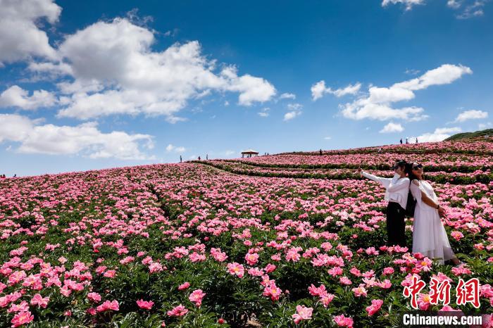 游人在花海拍照游玩。夏日里,甘肃省武威市古浪县古丰镇十里花海基地,千亩芍药花竞相绽放。(图片来源:中新网)