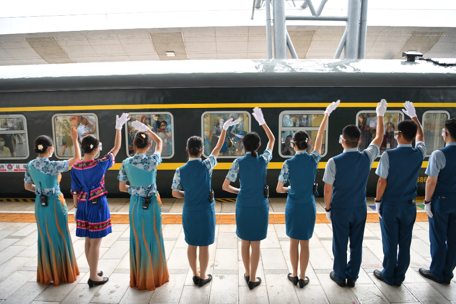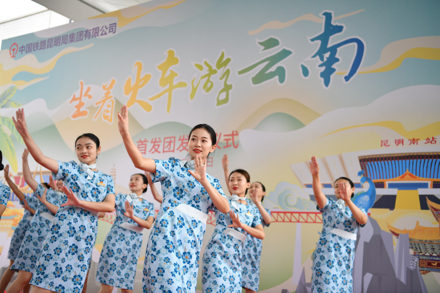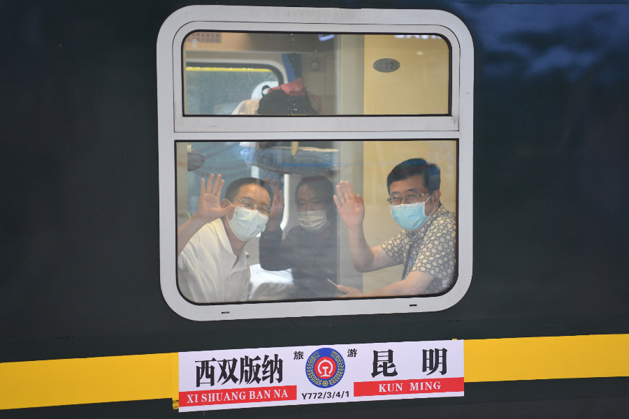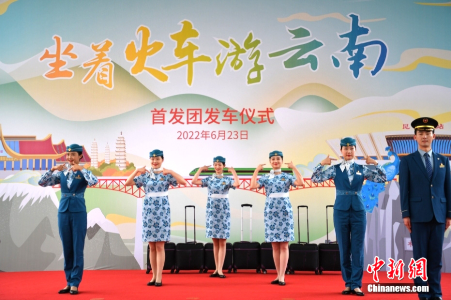 【欧洲时报网】6月23日,载着400多游客和80名抗疫医护人员的昆明至西双版纳Y771次旅游专列从昆明站始发,一路向南,经中老铁路运行4小时后,抵达西双版纳傣族自治州景洪市,这是“坐着火车游云南”首趟旅游专列,标志着云南铁路与文化旅游创新融合发展迈出实质性步伐。