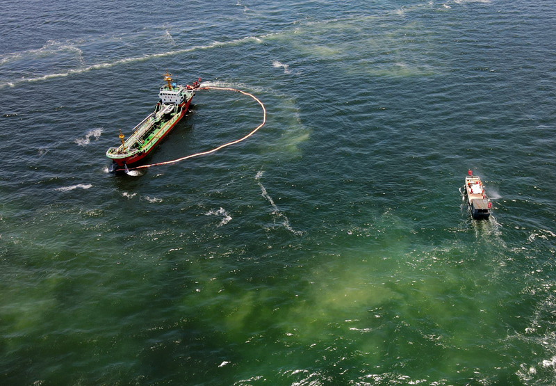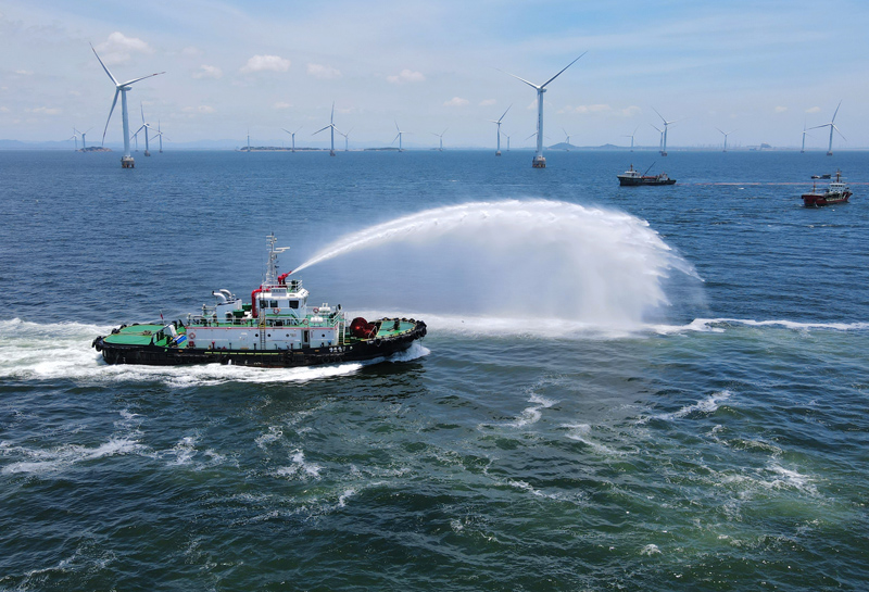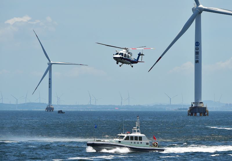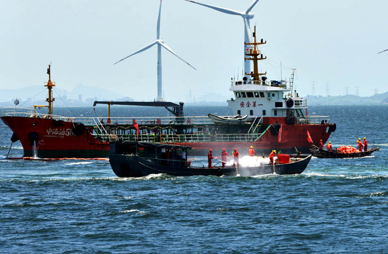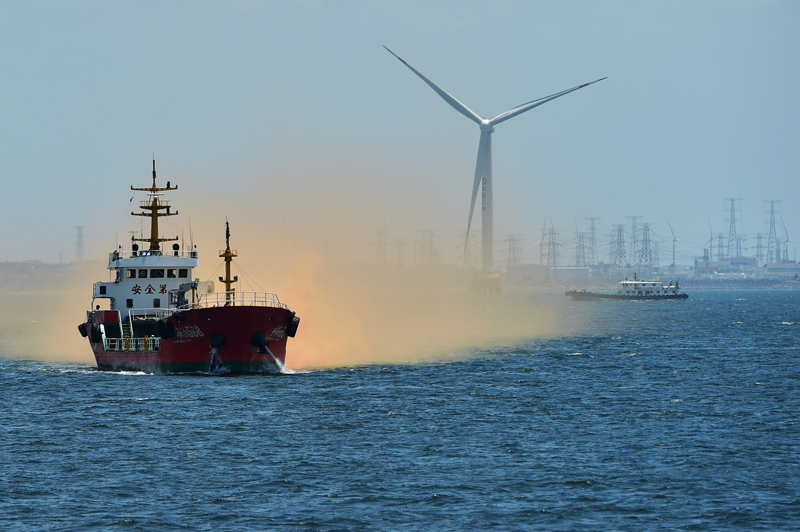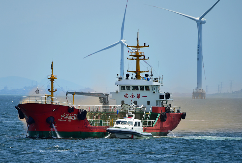 6月28日,一艘“载运”危化品的船舶模拟在进港途中触碰海上风电场风机平台,导致船上燃料油和危化品泄漏。(图片来源:新华社)