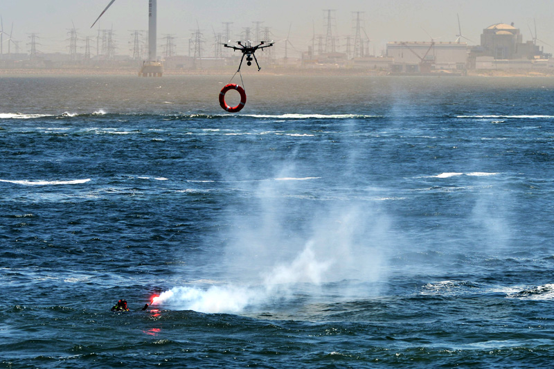 无人机到达“落水”人员位置,投放救生圈助遇险人员采取自救。(图片来源:中新社)