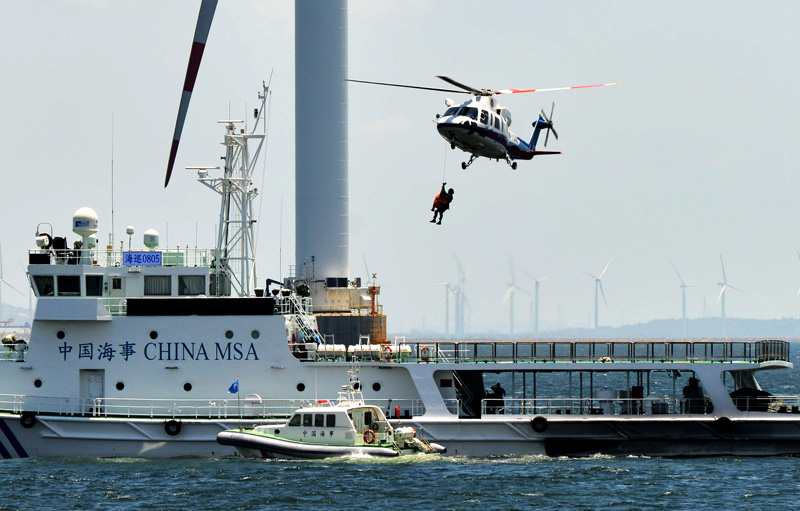 6月28日,参加演练的海空立体救援力量赶往演练现场。(图片来源:新华社)