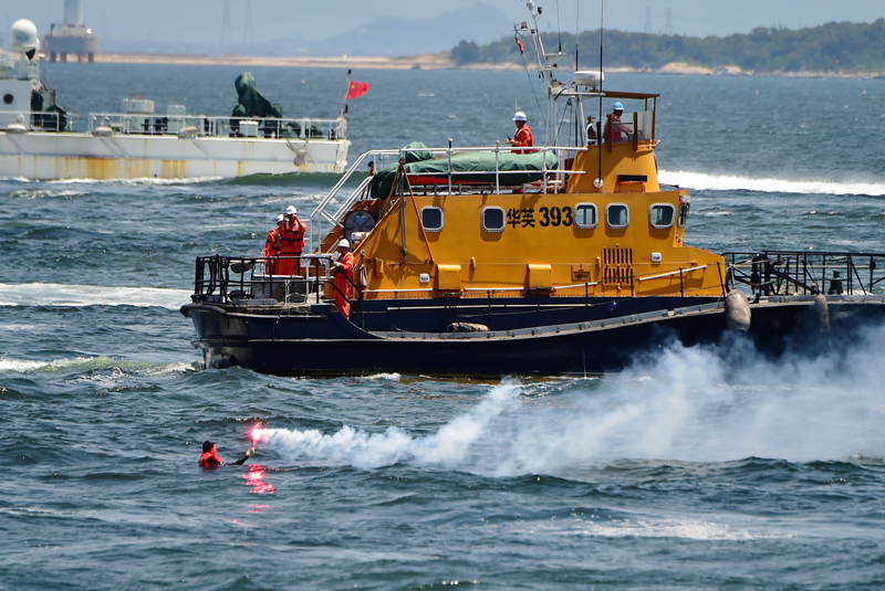 6月28日,参加演练的“华英393”救助艇准备救助“落水”船员。(图片来源:新华社)