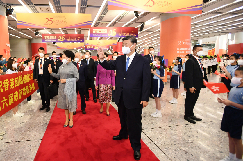 习近平抵达香港时在采访区向在场记者问好,向香港同胞致以热烈祝贺和美好祝愿。