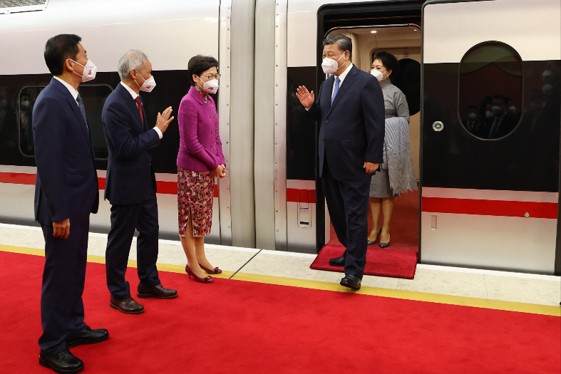 习近平和夫人彭丽媛步出车厢,香港特别行政区行政长官林郑月娥和丈夫林兆波上前迎接。