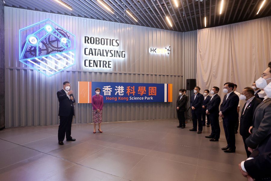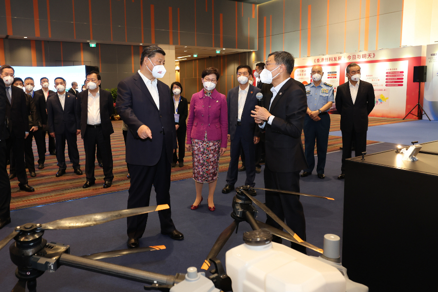 习近平在科学园展厅听取香港创新科技发展、深港创新科技发展互动、香港科学园发展等情况介绍,观看香港代表性创科企业展示。