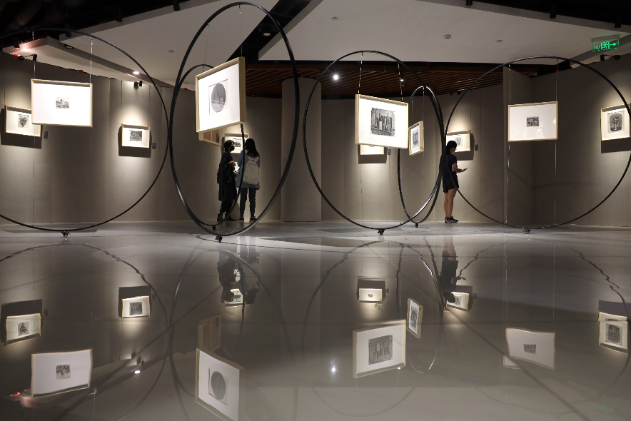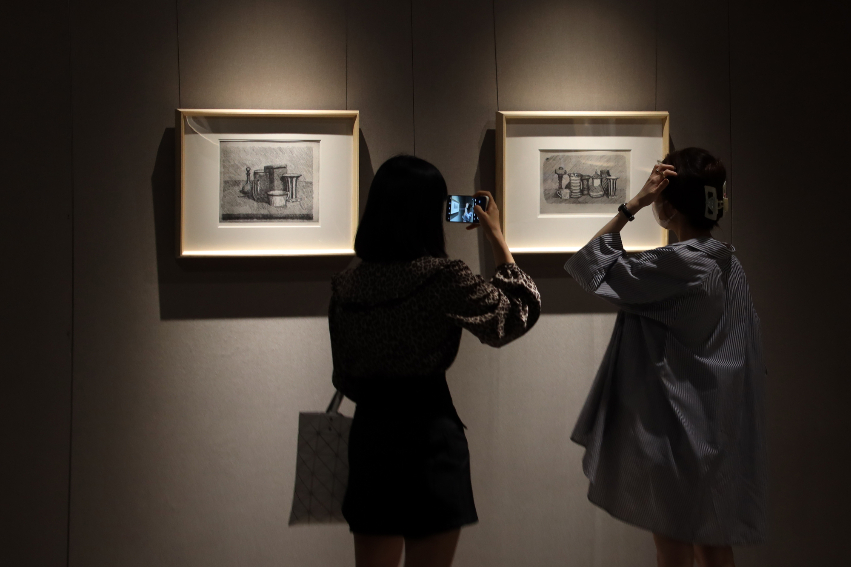 在莫兰迪的整个艺术生涯中,他创作了多达132幅版画,全部选用了黑白色。图为莫兰迪版画作品吸引观众参观拍摄。