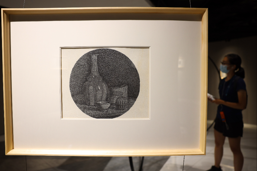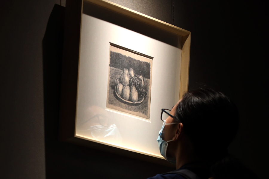 他以杯子、盘子、瓶子、盒子、罐子以及普通的生活场景作为自己的创作对象,用娴熟的笔触刻画静物与风景,让观众沉浸在他诗一般的世界里。图为一幅创作于1927年的蚀刻版画作品《梨和葡萄》吸引观众近距离参观。