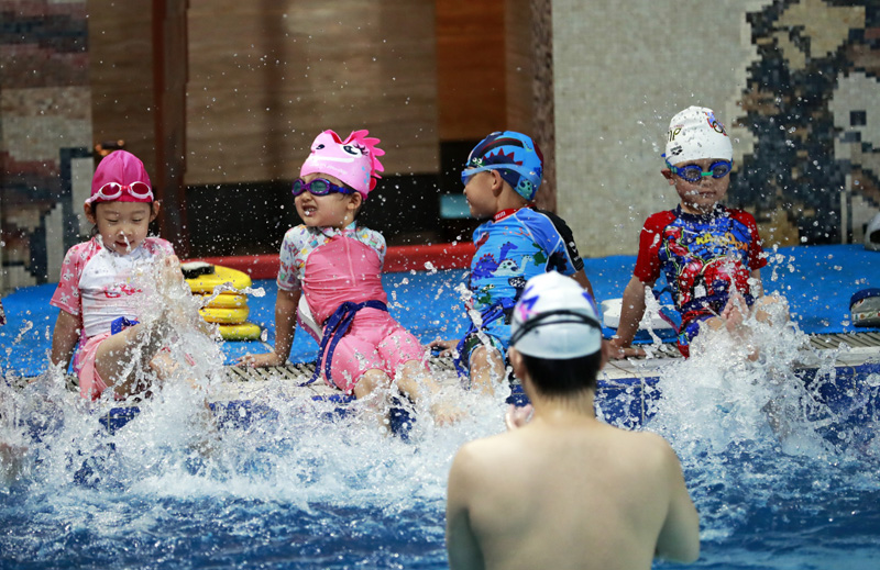 7月4日,上海一室内游泳馆正式对外开放,暑期游泳班的小朋友们在泳池里欢快畅游。图为小朋友在教练的带领下体验游泳打水。(图片来源:中新社)