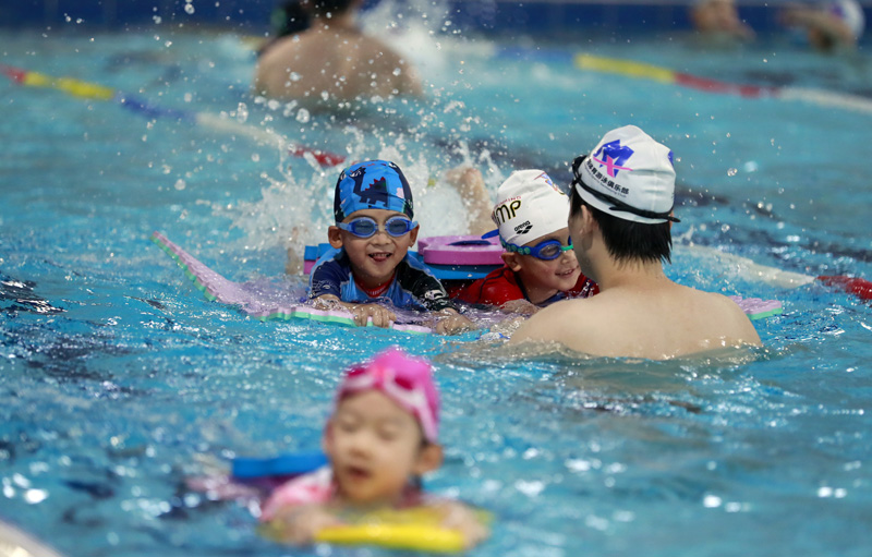 7月4日,上海一室内游泳馆正式对外开放,暑期游泳班的小朋友们在泳池里欢快畅游。(图片来源:中新社)