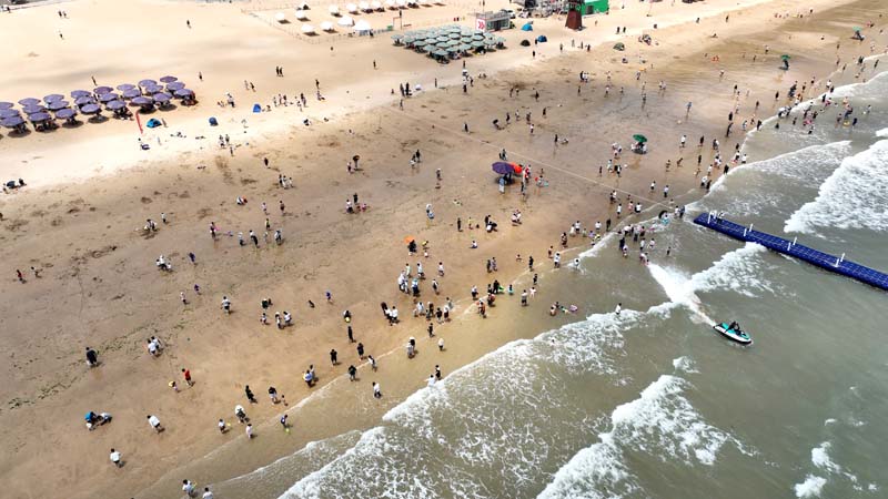 7月3日,市民和游客在江苏省连云港市连岛大沙湾海滨浴场戏水消暑(无人机照片)。(图片来源:新华社)
