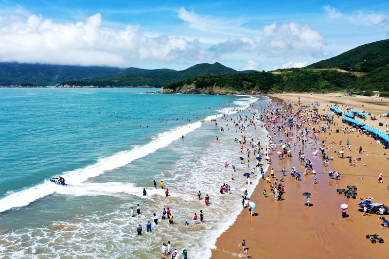 7月3日,游客在浙江省舟山市普陀区朱家尖南沙海滩戏水游玩。(图片来源:新华社)