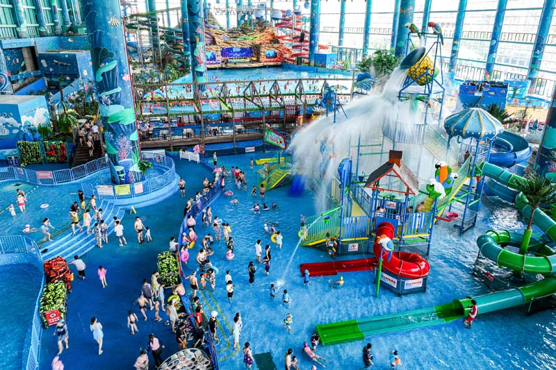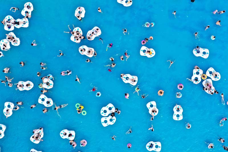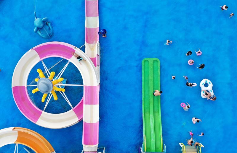 市民在位于南昌市湾里管理局的保利冰雪水世界戏水游玩(7月1日摄,无人机照片)。(图片来源:新华社)