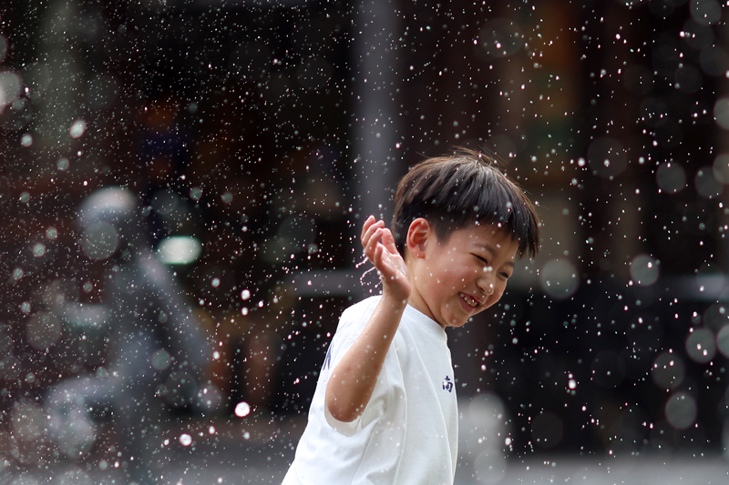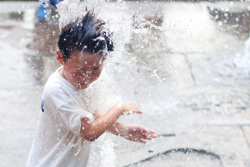 6月29日,江苏南京高温持续,在城南一喷泉处,孩子戏水觅清凉。(图片来源:中新社)