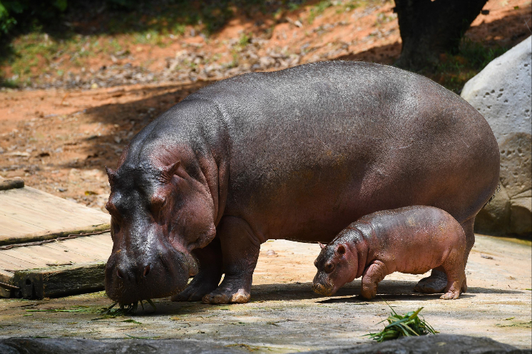 7月8日,广州长隆野生动物世界自驾游览区的河马宝宝紧跟着妈妈。(图片来源:本文图片均自新华社)