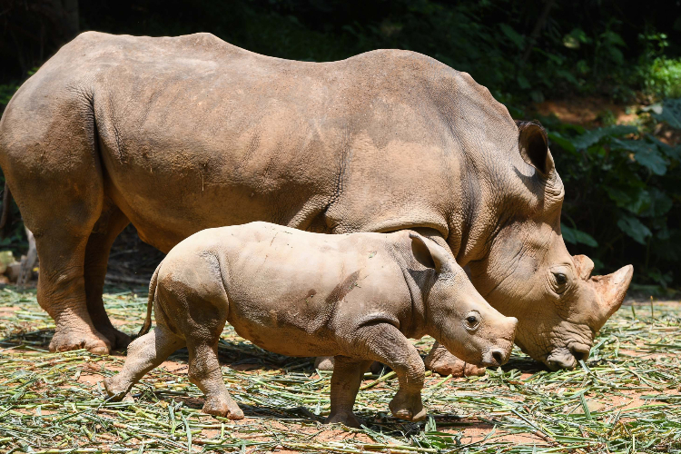 7月8日,广州长隆野生动物世界自驾游览区一只出生百日的白犀牛宝宝“西西”紧跟着妈妈“维维”。