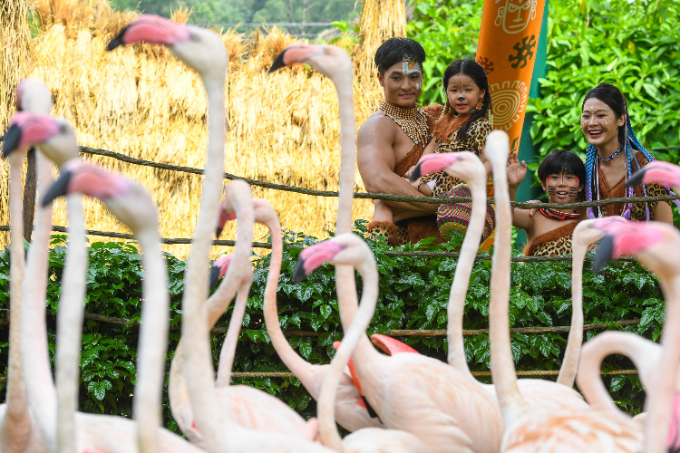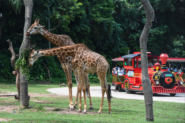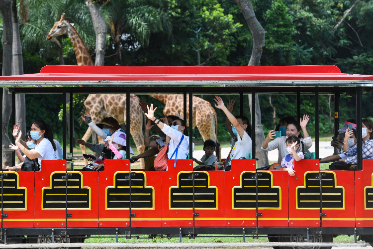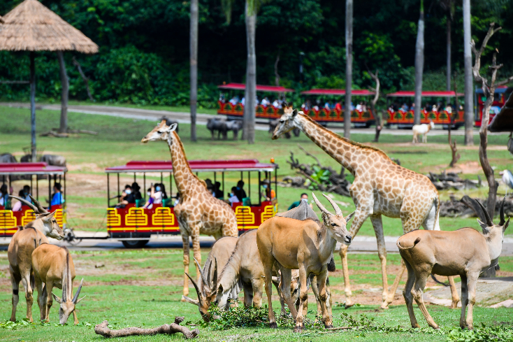 7月8日,游客乘坐小火车在广州长隆野生动物世界自驾游览区近距离观察非洲草原动物。