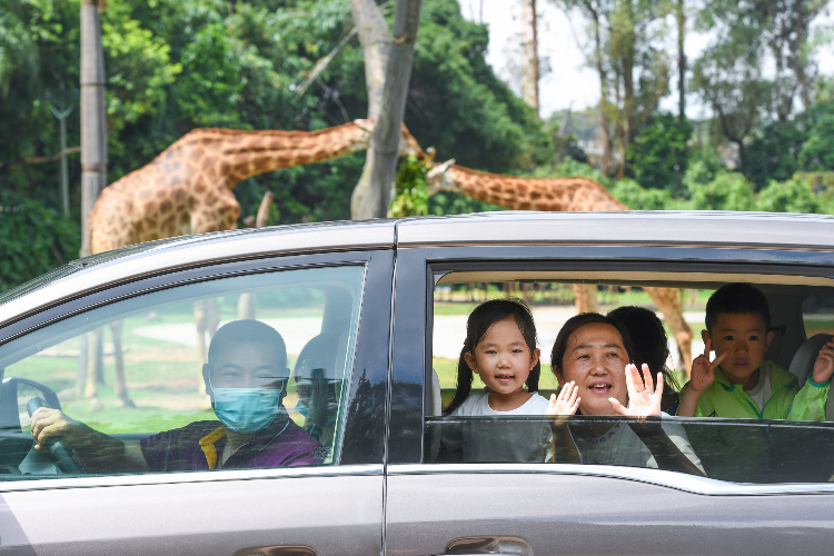 7月8日,游客在广州长隆野生动物世界自驾游览区近距离观察非洲草原动物。