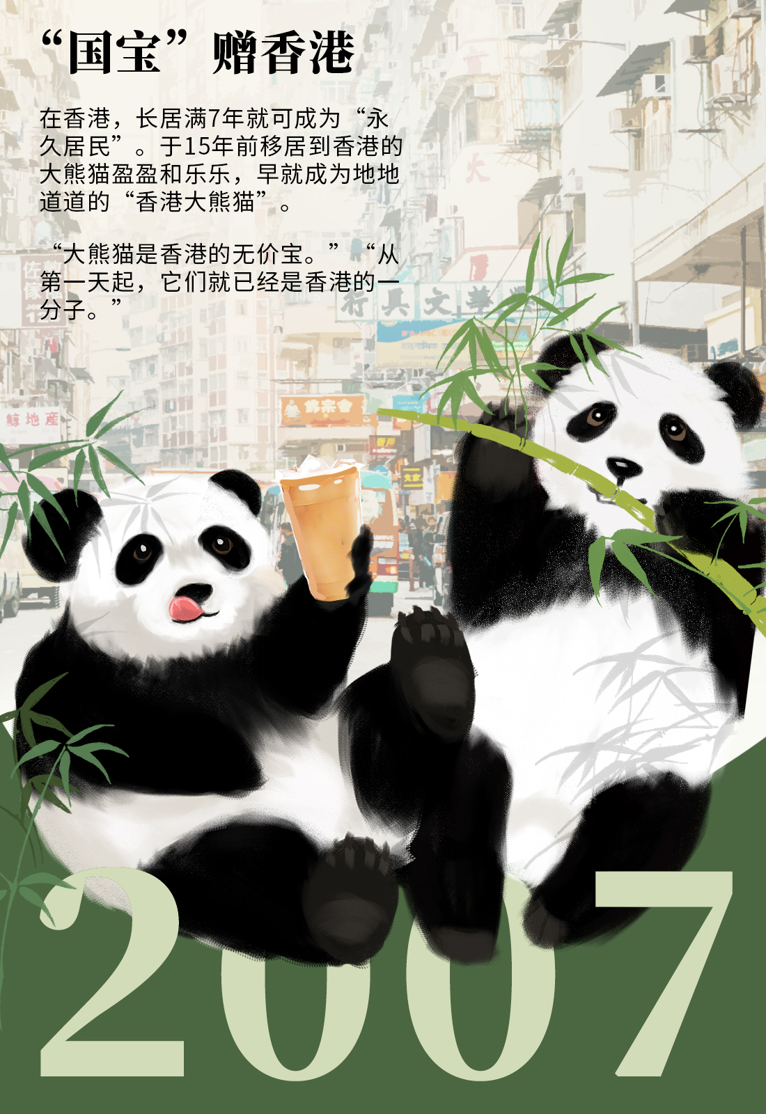 其中,大熊猫佳佳的港味最浓——它每天要喝三五杯香港独有的饮料“益力多”作为辅餐,才能满意。