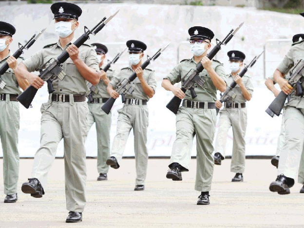 在香港警察学院,香港警察仪仗队在进行中式步操训练。(图片来源:新华社)