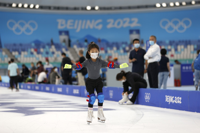 7月9日,一名小朋友在国家速滑馆内滑冰。(图片来源:中新社)