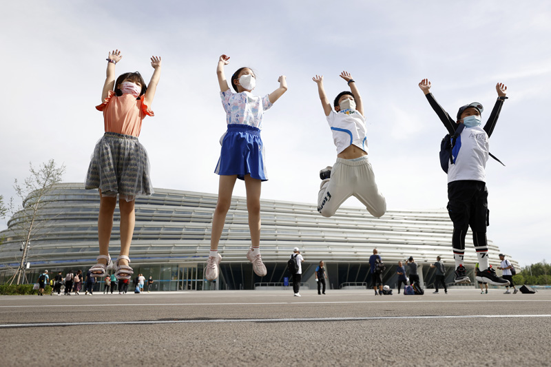 7月9日,小朋友在国家速滑馆外拍照留念。(图片来源:中新社)