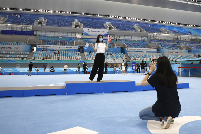 7月9日,市民在国家速滑馆内的冬奥颁奖台上拍照留念。(图片来源:中新社)