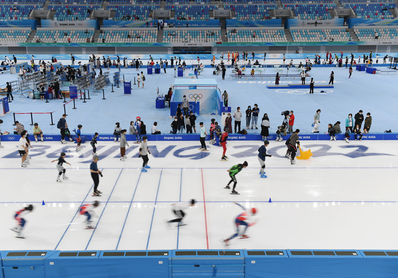 7月9日,游客在国家速滑馆体验滑冰。(图片来源:新华社)