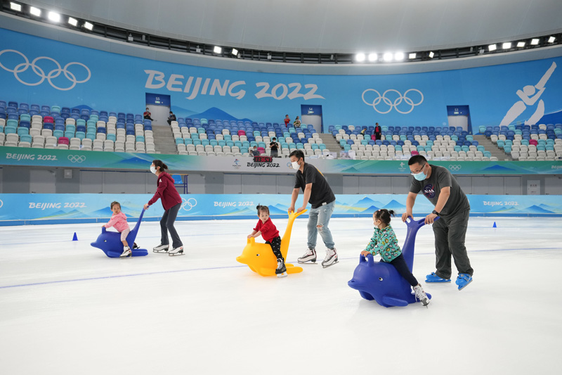 7月9日,在国家速滑馆,几位家长带着小朋友在冰面上进行滑冰体验。(图片来源:新华社)