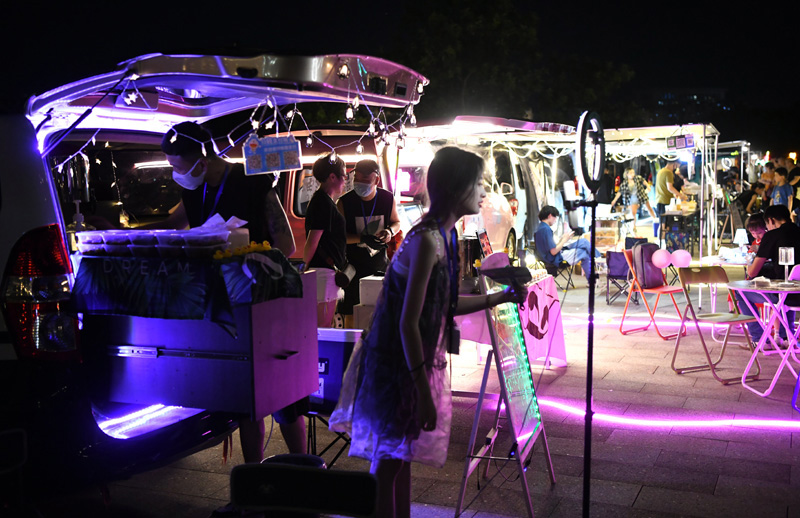7月8日晚,福建省福州市青年会广场,数十辆汽车整齐停放,车主们利用后备箱展销琳琅满目的自制产品。