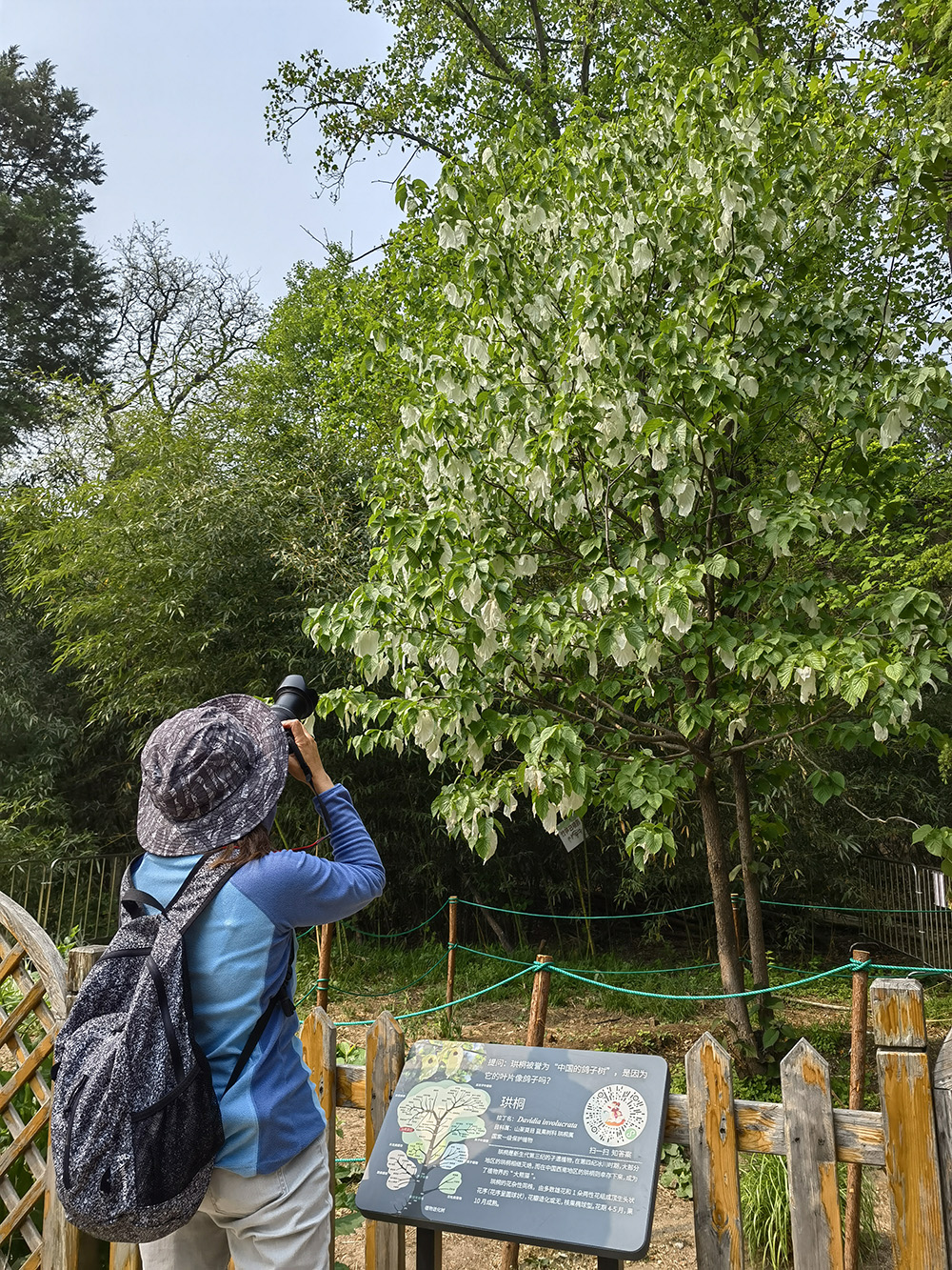 北京国家植物园的宿根花卉园里,被誉为“中国鸽子树”的国家一级保护植物——珙桐,吸引游客驻足欣赏。(图片来源:中新社)