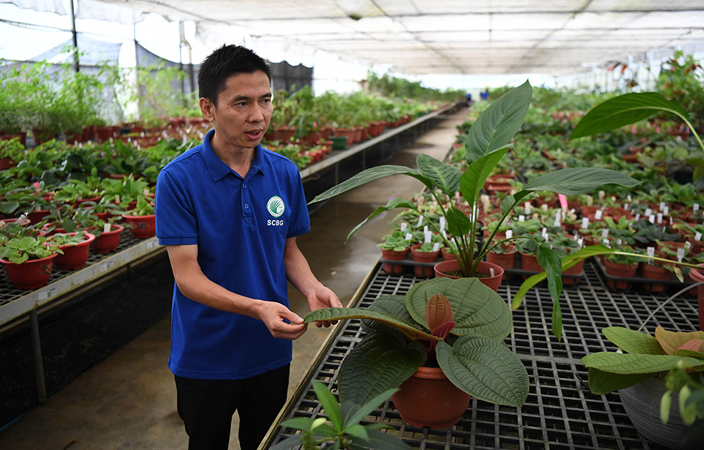 在华南国家植物园,工作人员介绍国家重点保护野生植物虎颜花。(图片来源:新华社)