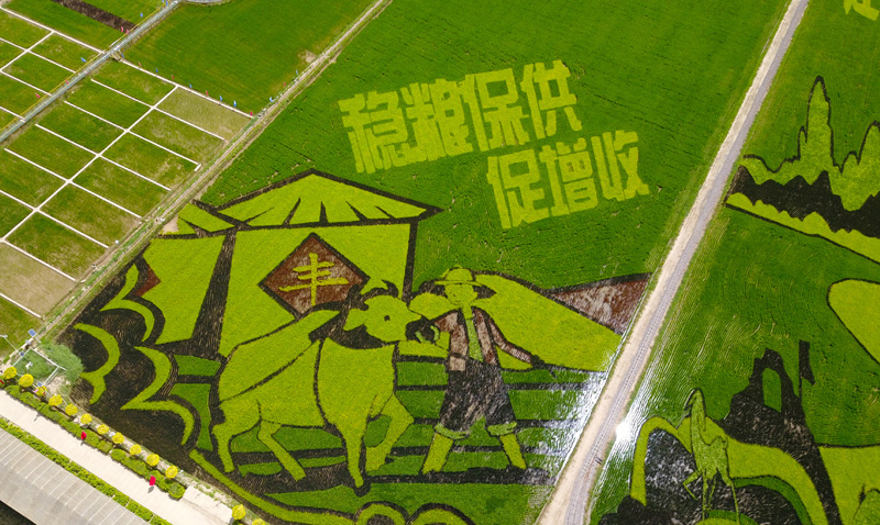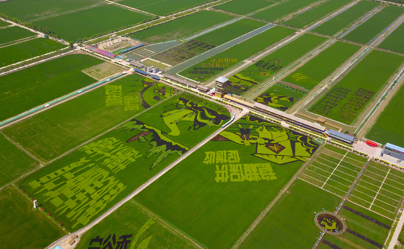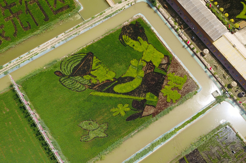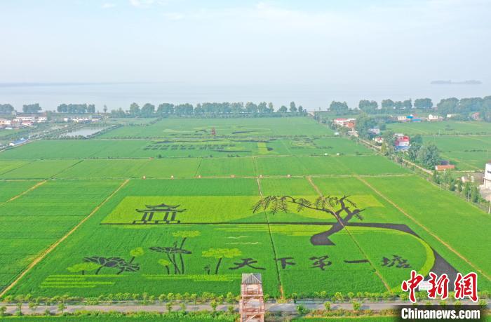 7月15日,安徽省淮南市寿县安丰塘镇戈店村,“天下第一塘”安丰塘主题稻田画惟妙惟肖,呈现在美丽田地中。(图片来源:中新网)