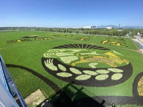 大地为纸,禾苗为墨,一幅占地40亩的稻田画亮相北京市丰台区王佐镇佃起村。(图片来源:《北京日报》)