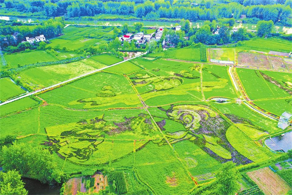 河南固始县南大桥乡谢楼村大别山农业艺术公社的稻田画惟妙惟肖。(图片来源:河南日报)