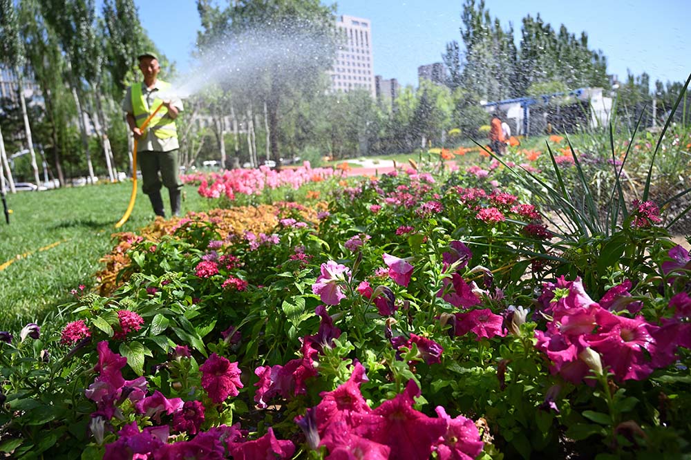 工作人员给口袋公园内的牵牛花浇水。(图片来源:中新社)