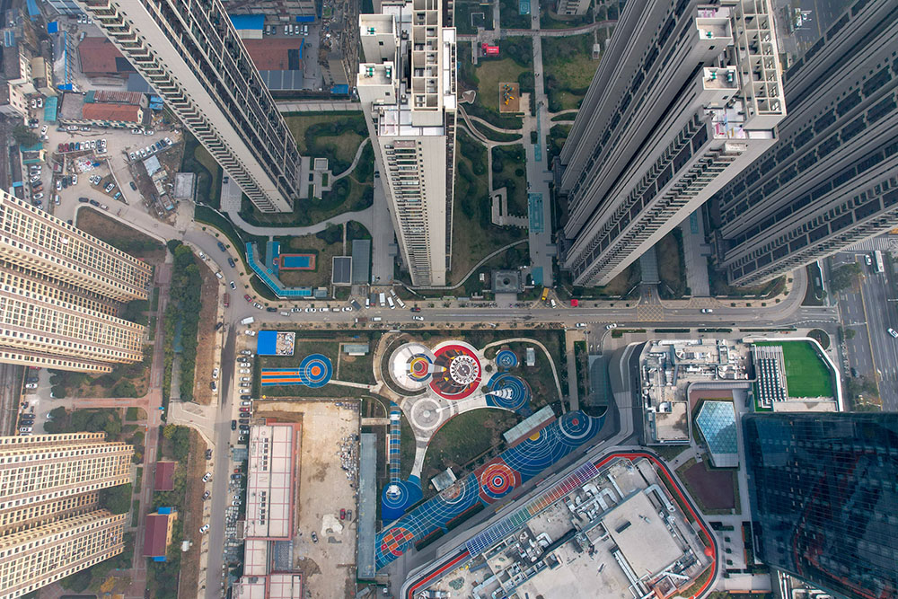 航拍武汉市汉阳区汉阳大道万科未来中心虫洞公园。(图片来源:中新社)