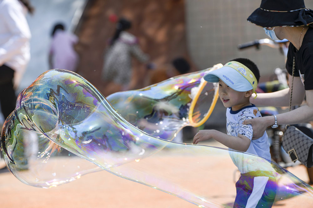 市民在武汉江岸区常青北路东侧康居拾光记公园游玩锻炼。(图片来源:中新社)
