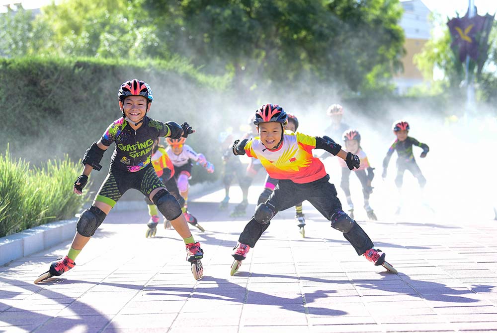 小朋友在鄂托克前旗一个“迷你公园”里玩轮滑。(图片来源:新华社)
