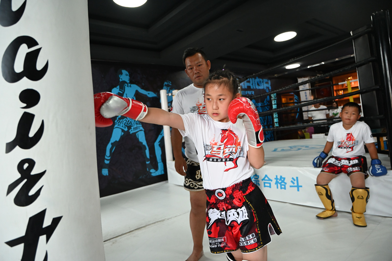 8月1日,内蒙古呼和浩特,儿童在一家综合格斗训练馆内训练。(图片来源:中新社)