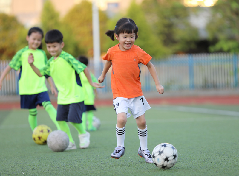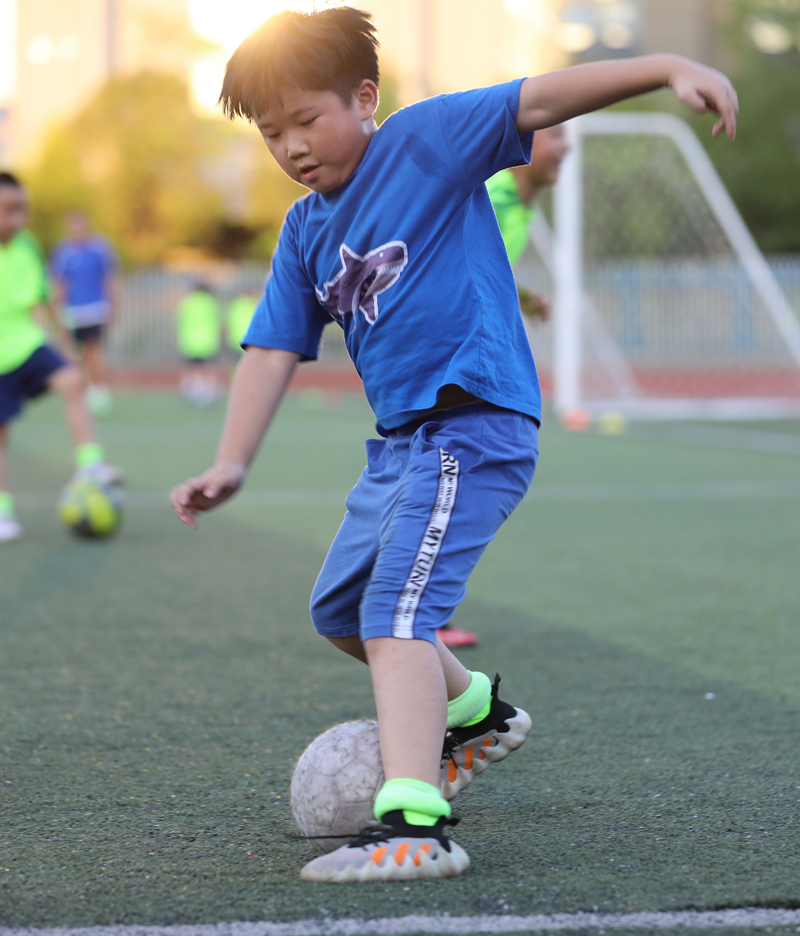 7月27日,小朋友在湖南省永州市道县第一中学足球场上练习足球。(图片来源:新华社)