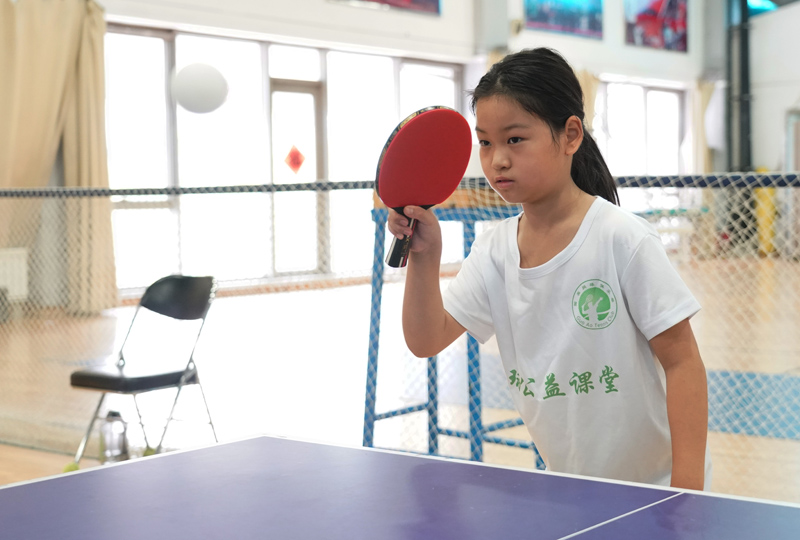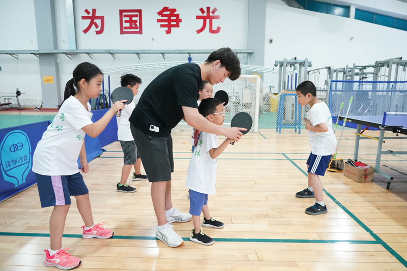 7月26日,在国家奥林匹克体育中心综合训练馆,参加夏令营的小朋友进行乒乓球练习。(图片来源:新华社)