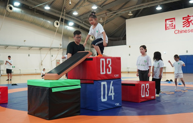 7月26日,在国家奥林匹克体育中心综合训练馆,参加夏令营的小朋友进行体能训练。(图片来源:新华社)