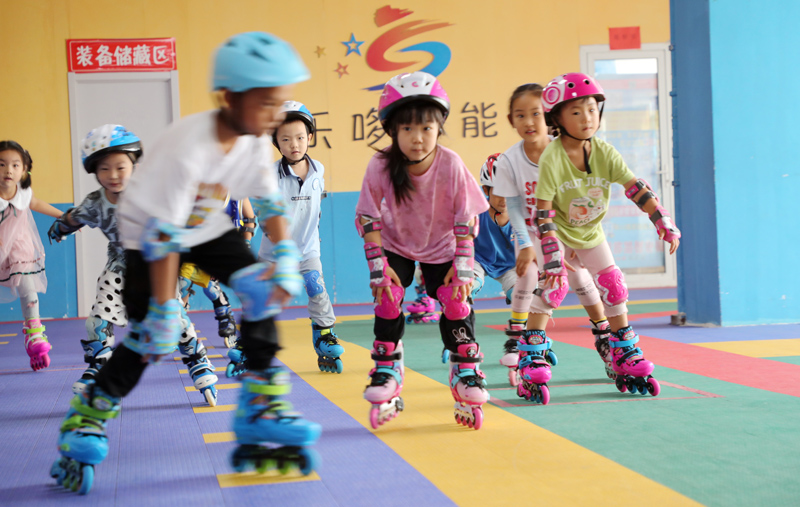 7月25日,在山东省东营市东营区文汇街道一体育运动培训学校教室内,孩子们在练习轮滑。(图片来源:新华社)