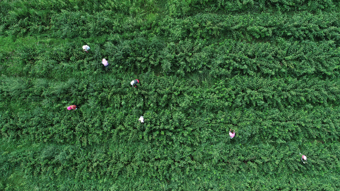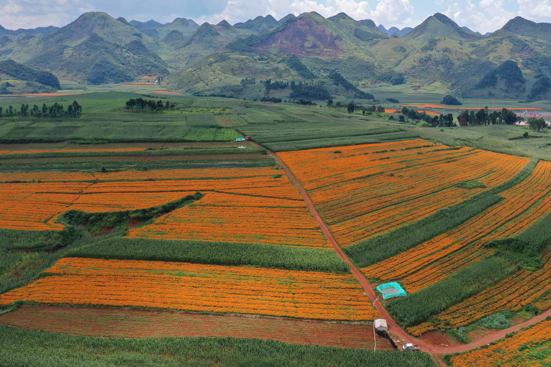 7月29日,航拍云南文山丘北县的万寿菊田。目前,正值万寿菊成熟采收季节,在云南文山壮族苗族自治州,丰收的万寿菊田变成一片片金色的海洋。(图片来源:中新社)