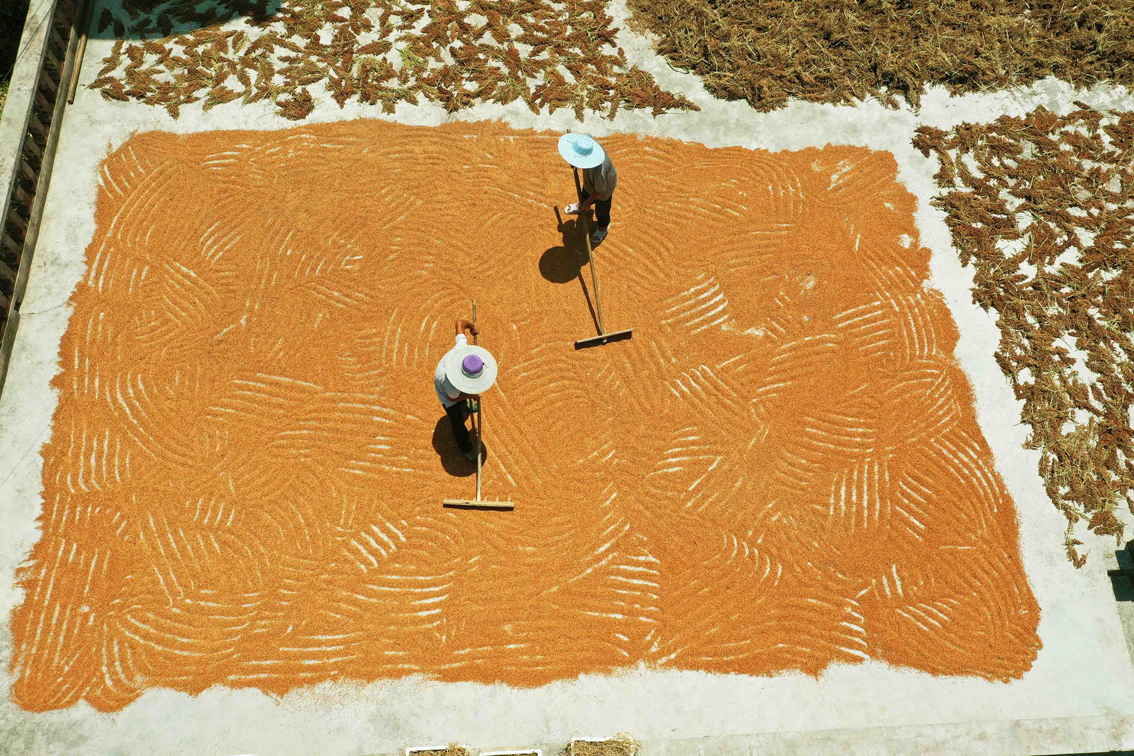 7月31日,在贵州省赤水市长沙镇高洞村,村民在晾晒高粱(无人机照片)。(图片来源:新华社)