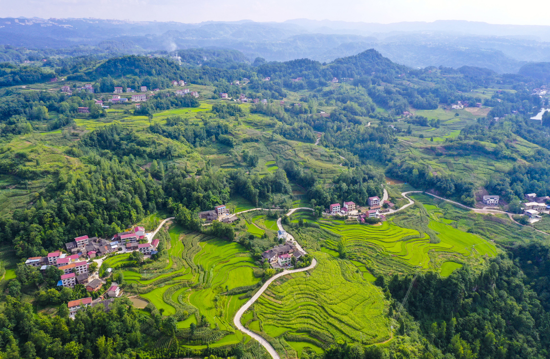 夏日时节,重庆市万州区恒合土家族乡八一村一带的稻田、民居、树木等相映成趣,构成一道道秀美的夏日风景线。图为8月2日拍摄的重庆市万州区恒合土家族乡八一村风光。(图片来源:新华社)