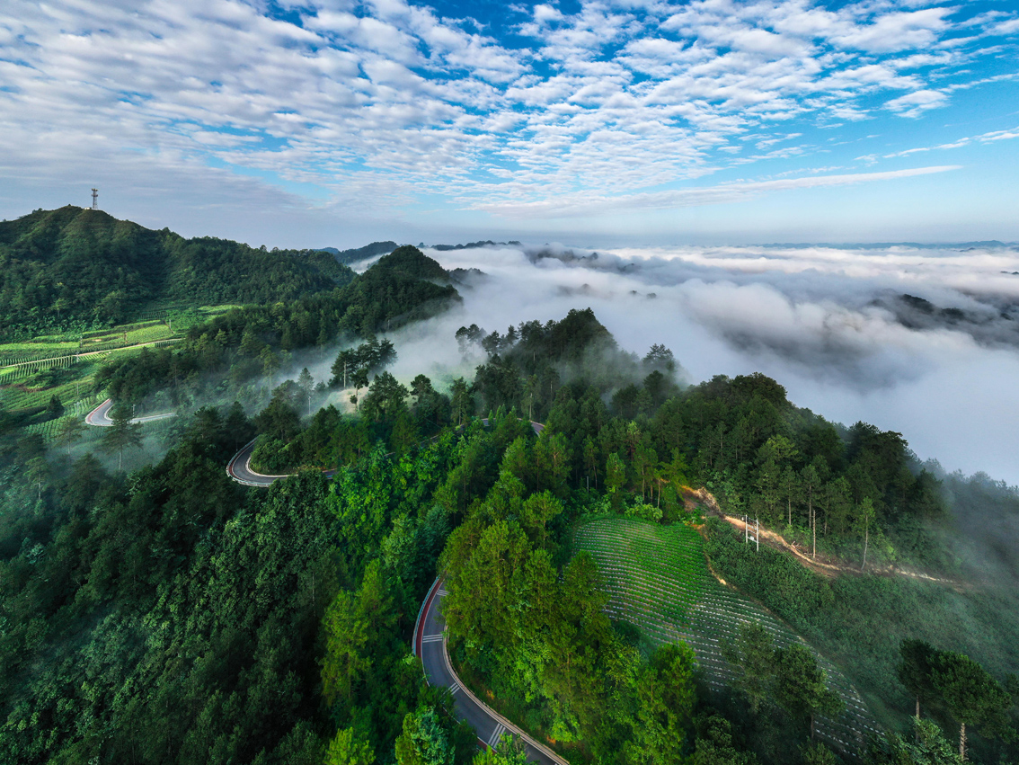 夏日,位于贵州省黔东南苗族侗族自治州施秉县的黑冲景区绿意盎然,远山、森林、公路在云海中若隐若现,犹如水墨画卷。图为7月29日拍摄的贵州省施秉县黑冲景区晨景。(图片来源:新华社)