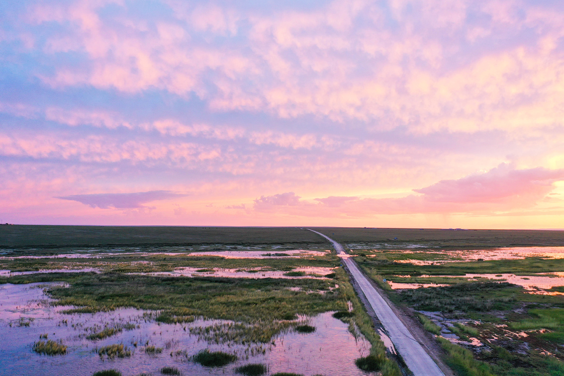 夏日,内蒙古锡林郭勒草原一碧千里,牛羊散落其中,河流蜿蜒曲折,景色宜人。图为在内蒙古东乌珠穆沁旗拍摄的夕阳下的草原。(图片来源:新华社)