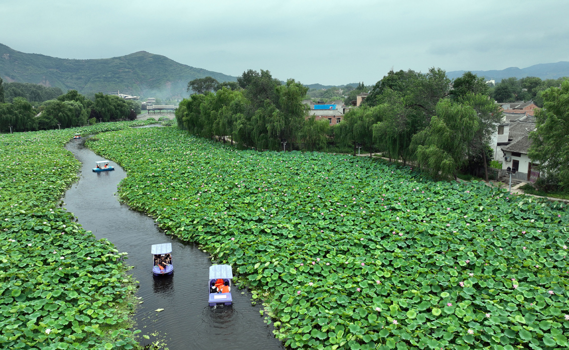 近日,秦岭深处的陕西省商洛市丹凤县棣花古镇荷花盛开,吸引游人前来观赏。图为游人乘船在陕西省商洛市丹凤县棣花古镇的荷塘观赏荷花。(图片来源:新华社)