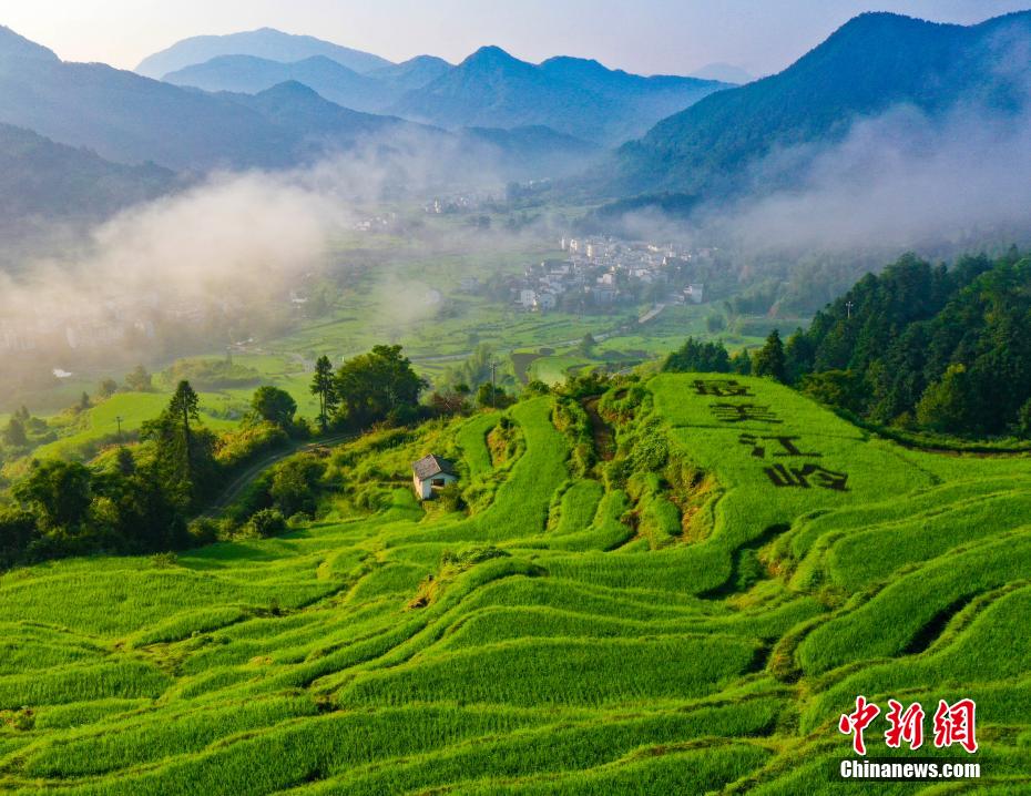 8月2日,航拍“中国最美乡村”江西上饶婺源县的江岭梯田,只见当地农民把数百亩梯田当作“画纸”,以五彩水稻为“画笔”,“最美江岭”四个大字点缀于梯田阡陌之间,与粉墙黛瓦、远山云雾一道,勾勒出了一幅秀美夏日田园画卷。(图片来源:中新网)